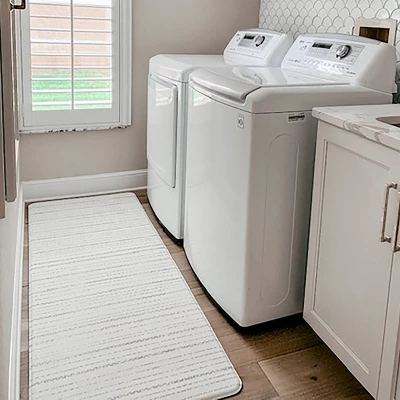 - Gray-and-white runner with the look of a designer rug and feel of a play mat