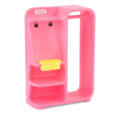 - Features include a storage rack to hang clothing (hangers not included), three shelves for shoes or accessories, a holder for markers and crayons and a stand up easel with two clips to hold your child’s fashion designs