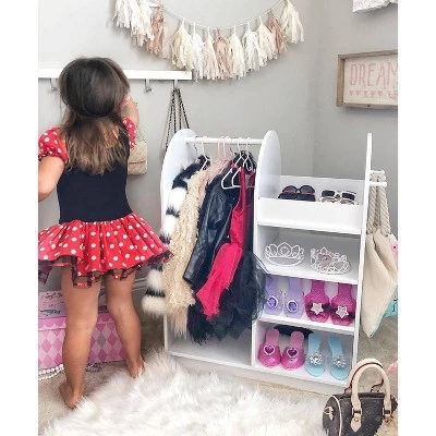 The Fashion Pretend Station in white by KidKraft keeps all your little diva’s accessories and costumes organized and ready for play. Dress-up time is more magical when you can clearly see all your clothes, jewelry, shoes and accessories all in one height-right furniture storage piece. Standing at over two-and-a-half-feet tall, this kid-sized setup has storage compartments to keep all their make-believe toys and accessories together. Hang clothes on the bar, display shoes, tiaras or makeup on the angled shelves. Loop scarves, necklaces, boas and more on the pegs on the side for last-minute additions to perfect the look. The shatterproof safety mirror lets kids make sure their costume is perfect.